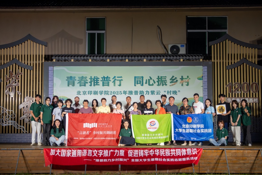 作为2025年“推普助力乡村振兴”全国大学生暑期社会实践志愿服务活动的1000支重点团队之一,北京印刷学院“言耕者”乡村振兴调研团(简称“调研团”)于7月12日至18日赴福建省宁德市周宁县浦源镇,开展了为期一周的“推普助力乡村振兴”暑期实践活动。调研团10名成员立足学校新闻传播学科的专业优势,深入田间地头,累计开展入户入营调研10余次,普通话教学、推普助力直播培训4场,拍摄推普乡村振兴短视频若干条,举办推普助力乡村振兴文艺演出1场,与当地返乡青年联合开展了2小时的公益助农直播,单场点赞量突破2.2万人次,以大学生视角探索出一条“语言赋能+文化创新”的乡村振兴实践路径。