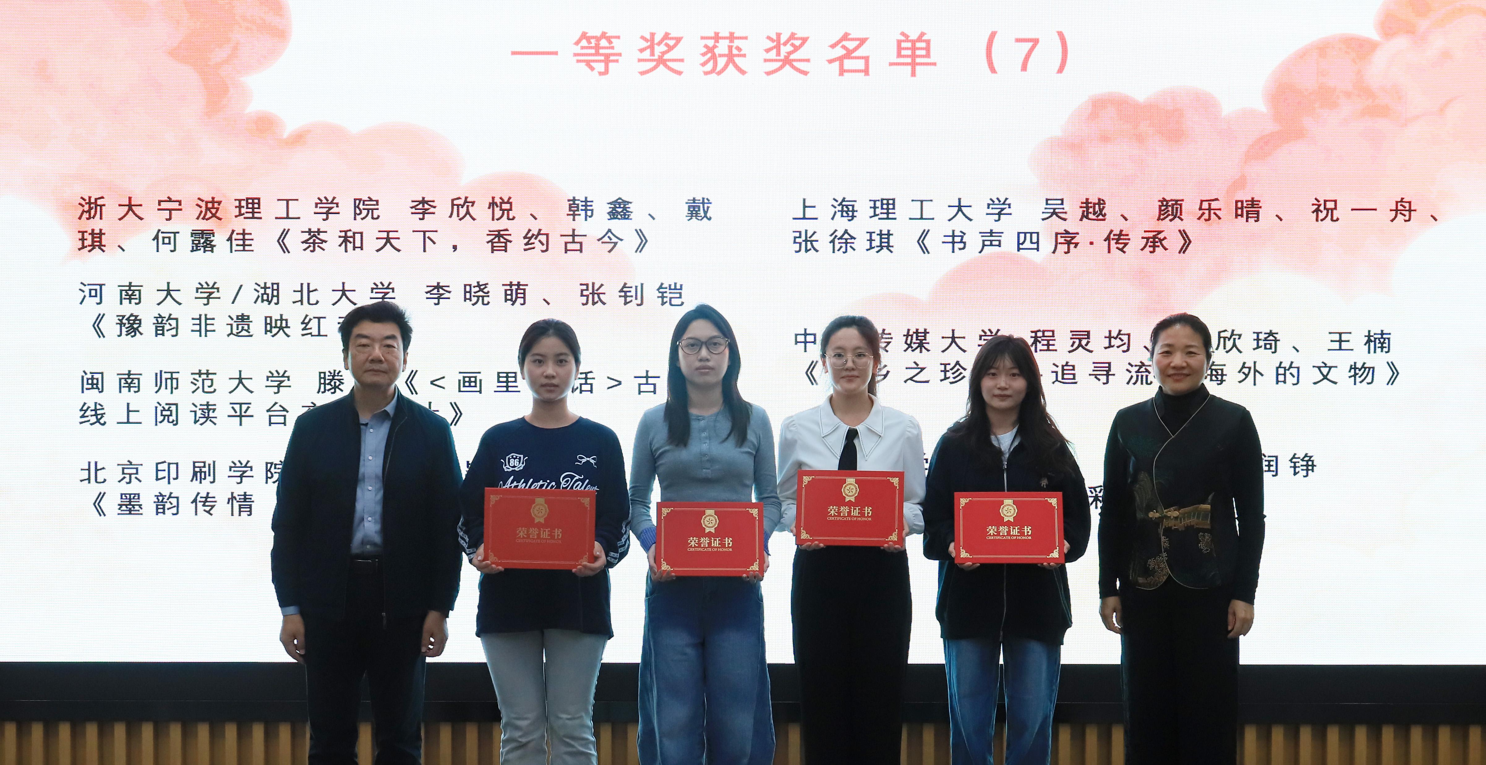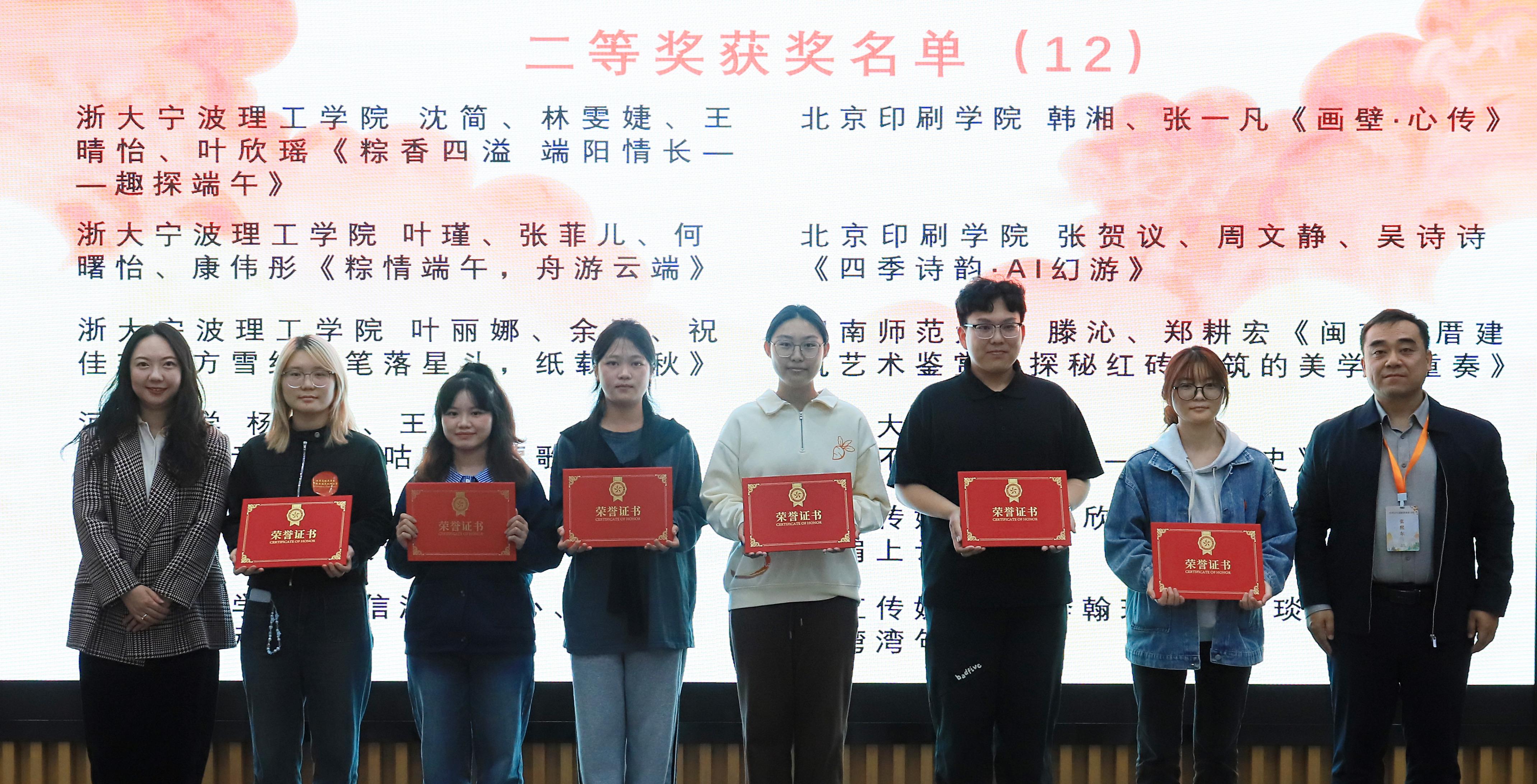 本届组织29份作品参赛的浙大宁波理工学院的聂晶磊教授获优秀组织奖。连续两届指导学生获得一等奖的闽南师范大学教授万丽慧荣获优秀指导教师奖。学校2023级数字出版专业的王镌、朱颖奇同学在袁萱老师指导下创作的作品《墨韵传情 印脉两岸》荣获一等奖,学校另获3个二等奖,1个三等奖。两岸学子以小组形式,在专业教师指导下,协作完成创作,既锻炼了团队合作能力,也增进了彼此的了解与友谊。