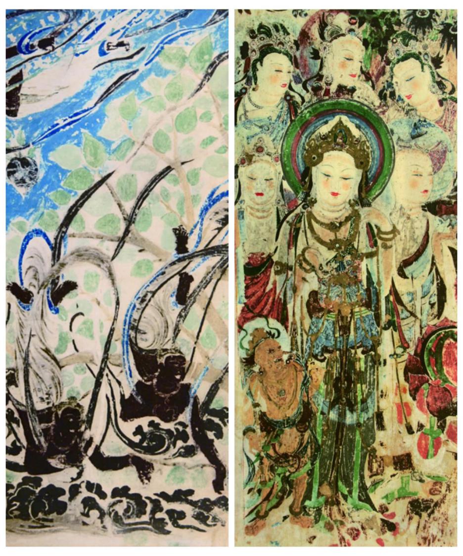 展品:敦煌三百二十一窟《飞天》(左)、敦煌五十七窟《美人菩萨》(右)