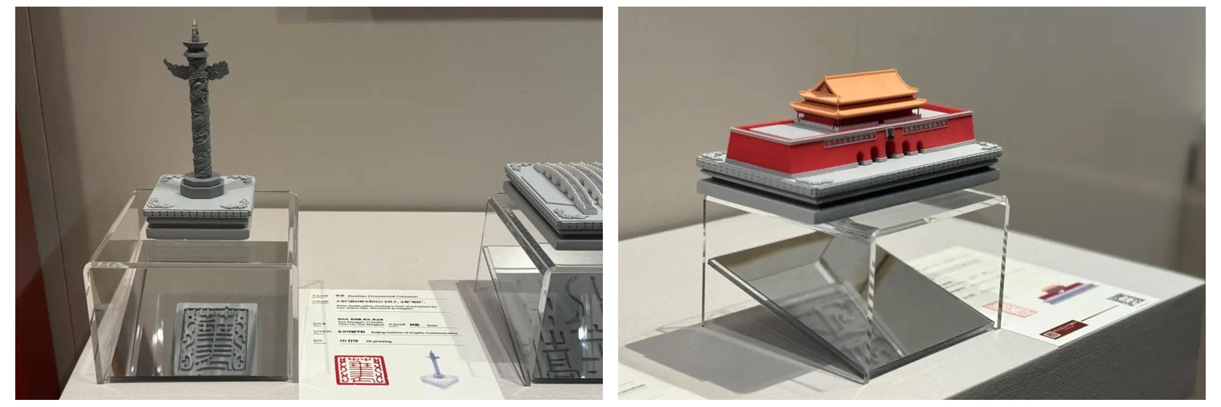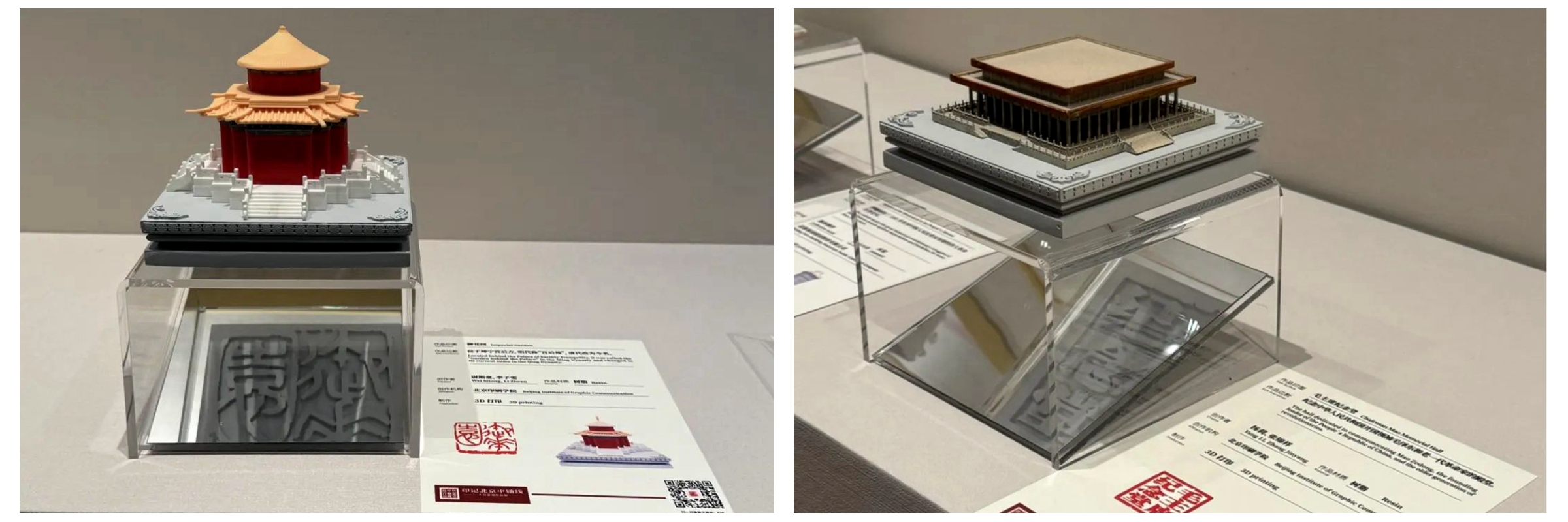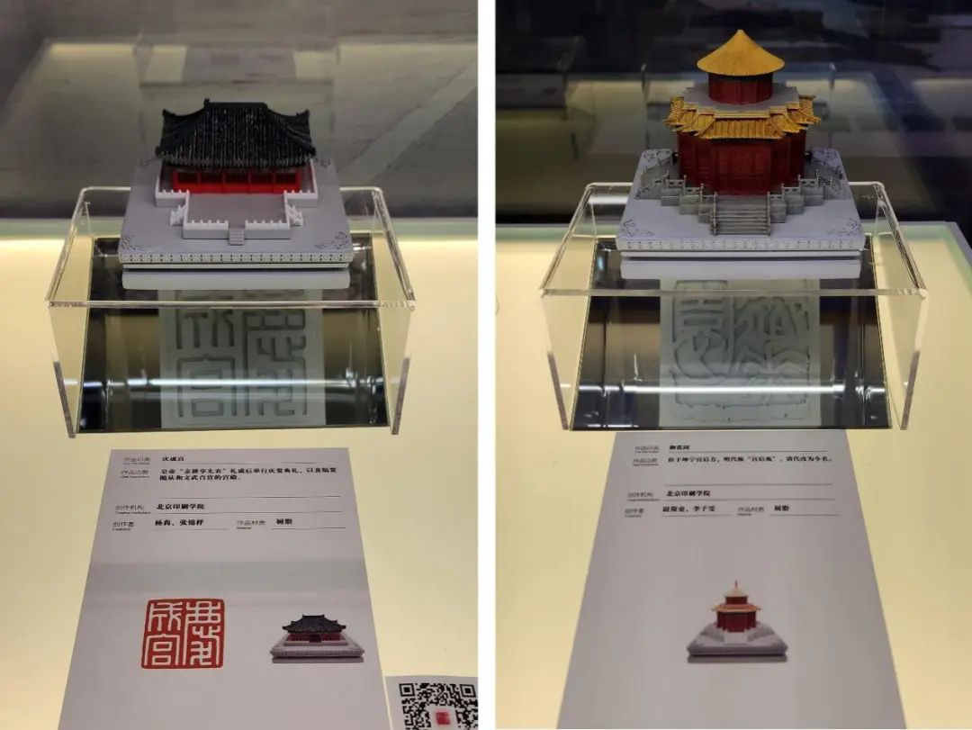 本次参展作品分为印面篆刻创作和印纽及印身设计制作两个部分,印面篆刻创作由窦向亲、龙友、崔迎春、黄勤、孙浩等教师团队完成。印纽及印身设计制作由杨莉、胡明辉、赵颖、杨默涵、牛明明、巫建等教师团队对中轴线上的代表性建筑进行高精度三维建模设计并完成3D打印制作,团队同时也为本次展览的虚拟展示部分搭建了建筑模型素材。