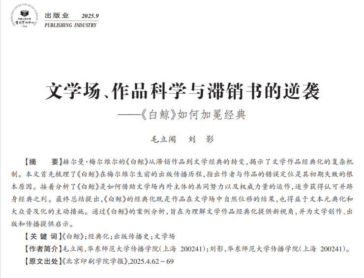 近日,《北京印刷学院学报》2025年第04期刊发的学术文章《文学场、作品科学与滞销书的逆袭——〈白鲸〉如何加冕经典》(作者:毛立闻、刘影),被中国人民大学复印报刊资料《出版业》2025年第09期全文转载。人大复印报刊资料以其严格的学术遴选标准、系统的学科覆盖与深度的知识整合能力,被业界广泛关注。此次转载不仅是对单篇论文学术价值的肯定,更是对来源期刊整体质量与学术导向的重要认证。