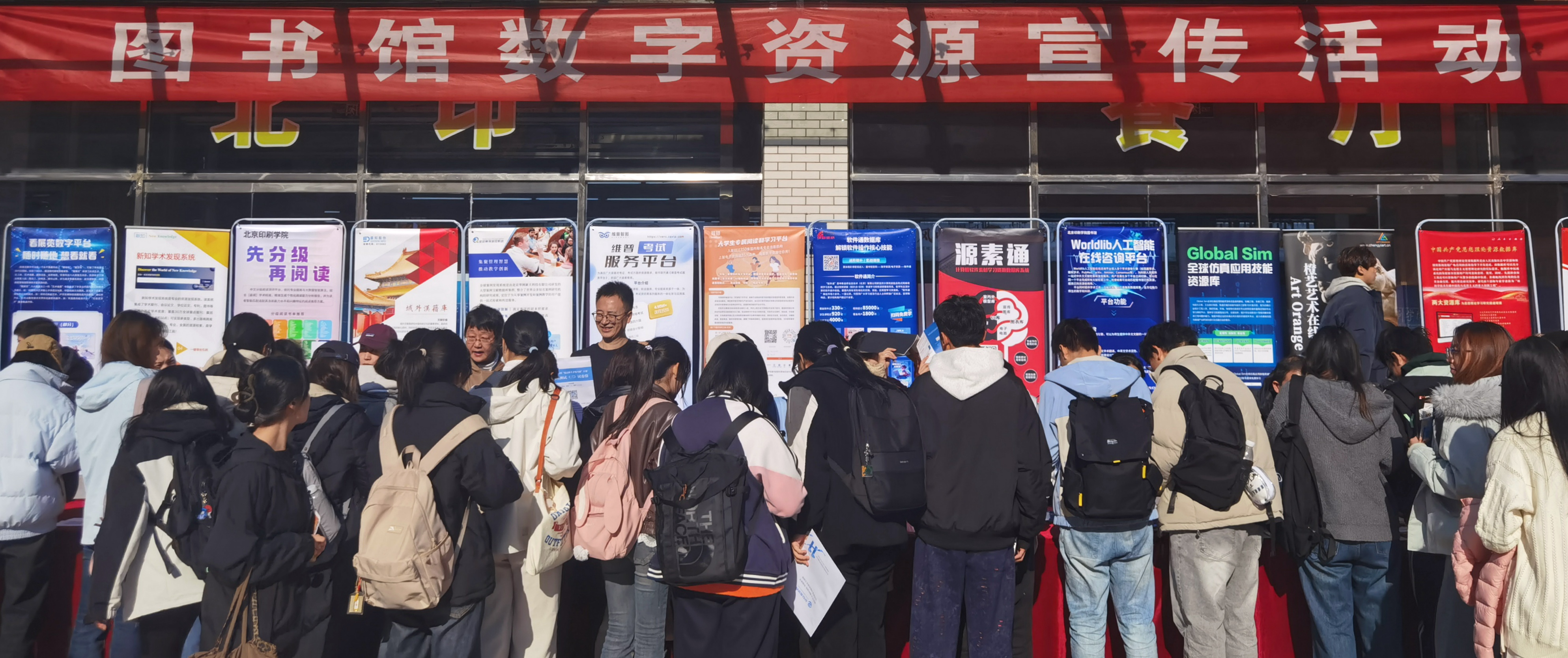 活动现场,中国知网、中国社会科学文库、中国共产党思想理论资源数据库、高校信息素养教育数据库、全球案例发现系统、畅想之星精品学科数据库、新知学术发现系统、可知国家知识服务平台、起点考研网、超星发现、读秀、百链、维普考试服务平台、维普中文期刊服务平台、学术投稿分析系统、龙源期刊、橙艺艺术在线、Worldlib、软件通、源素通、域外汉籍库、中华连环画数字图书馆、看展览数字平台、民国时期期刊全文库(1911-1949)&全国报刊索引、Springer期刊全文数据库、Ebsco全文数据库、全球仿真应用技能资源库等展架纷纷展出,图书馆老师和数据库服务单位工作人员热情地进行现场宣传推广活动,通过张贴海报、发放宣传册、发放礼品、现场答疑解惑等多种形式介绍图书馆数字资源,详细介绍各个数据库的特点和优势,展现出不同数据库服务师生不同需求的重要价值。